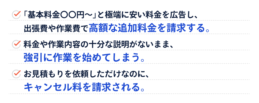 「広告の安い料金だけを見て依頼したら、作業後に何万円も高額な請求をされた」